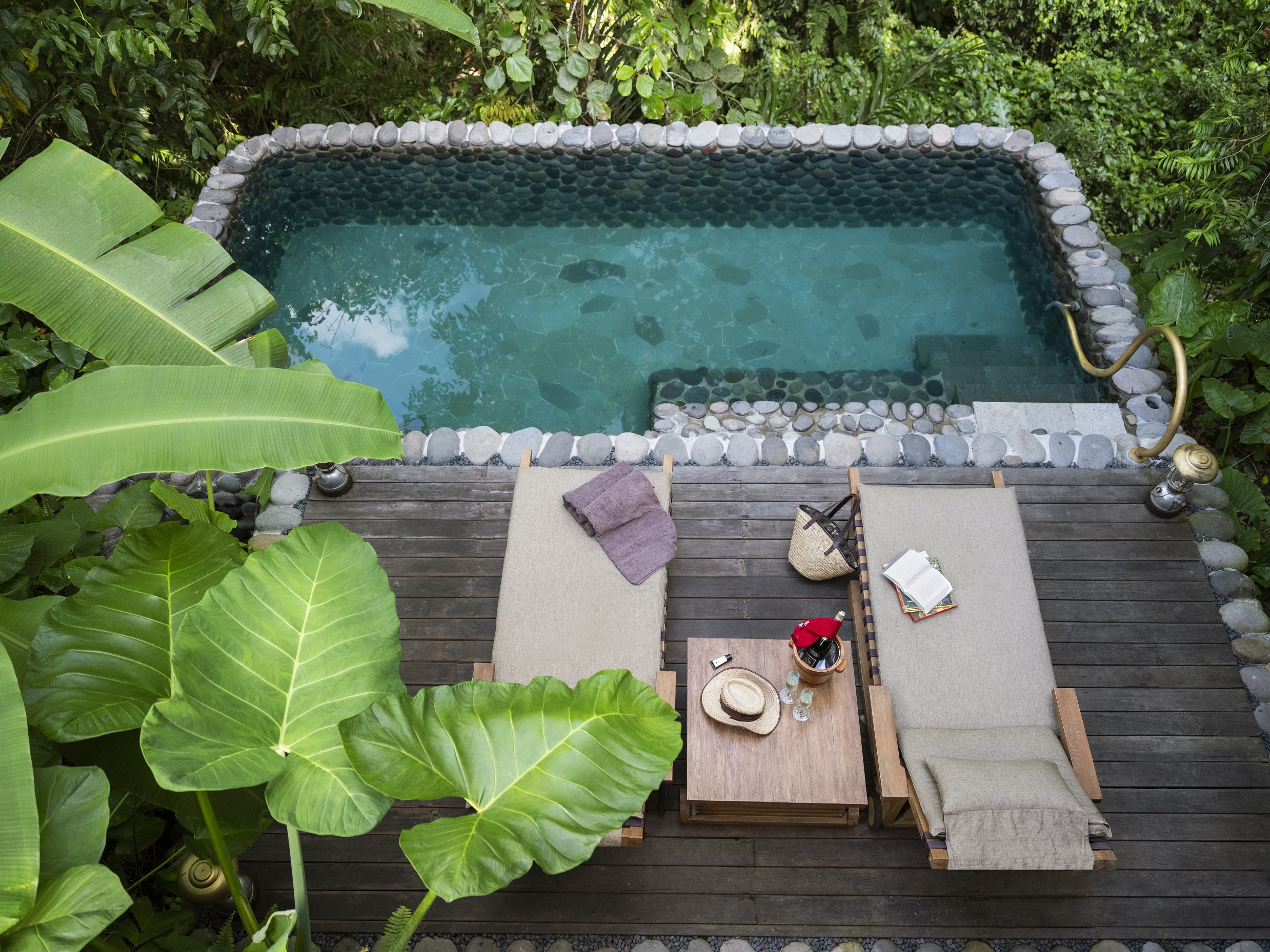 1베드룸 리버 텐트는 때묻지 않은 정글 전망을 제공하며 모든 텐트에는 전용 수영장, 대형 야외 데크, 실내 및 실외 욕실이 갖춰져 있습니다.