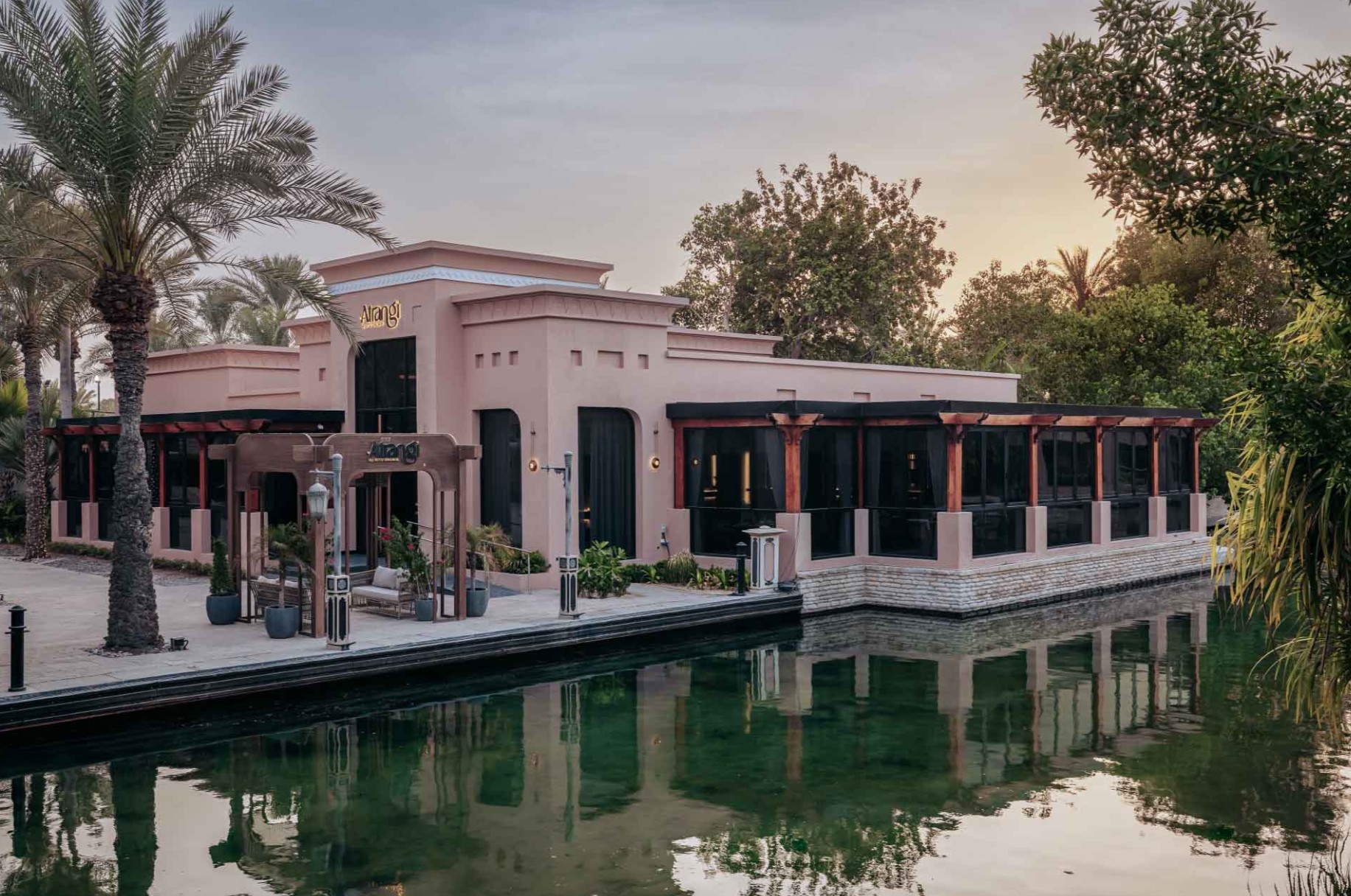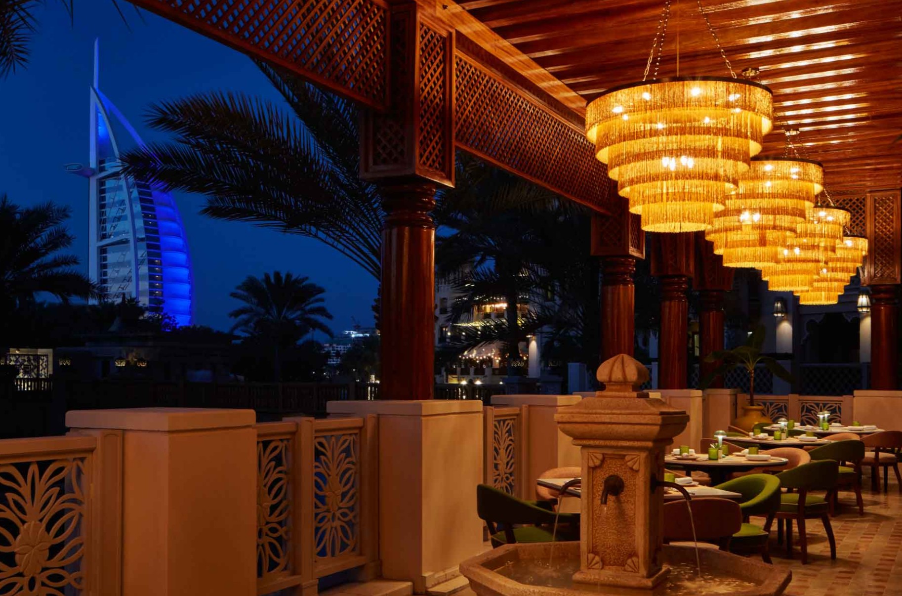 높은 야자수가 늘어선 그림 같은 수로를 따라 굽이굽이 걸으며 아라비아 만과 주메이라 부르즈 알 아랍의 감동적인 전망을 감상하세요. 두바이의 황금빛 해안선에 있는 왕족의 장소입니다.