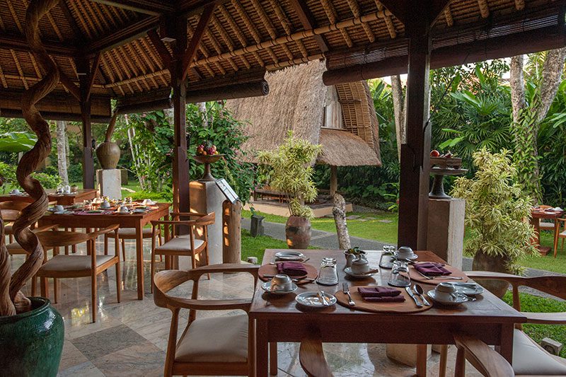 Komaneka Monkey Forest의 Garden Terrace Kitchen은 나무 그늘이 있고 열대 정원으로 둘러싸인 친밀하고 편안한 개방형 파빌리온입니다. 메뉴에는 맛있고 향기로운 인도네시아 요리가 있습니다. Pepes Ikan Kecarum: 레몬 바질과 야채 srombotan을 곁들인 바나나 잎에 매콤하게 구운 도미 필레 구이; 또는 채식주의자를 위한 Tempe Chili Mango: 망고, 양파, 고추, 캐슈넛을 칠리 타마린드 소스에 곁들인 잘게 썬 콩 케이크입니다. 모두 Komaneka의 재능 있는 수석 셰프가 만들었습니다.