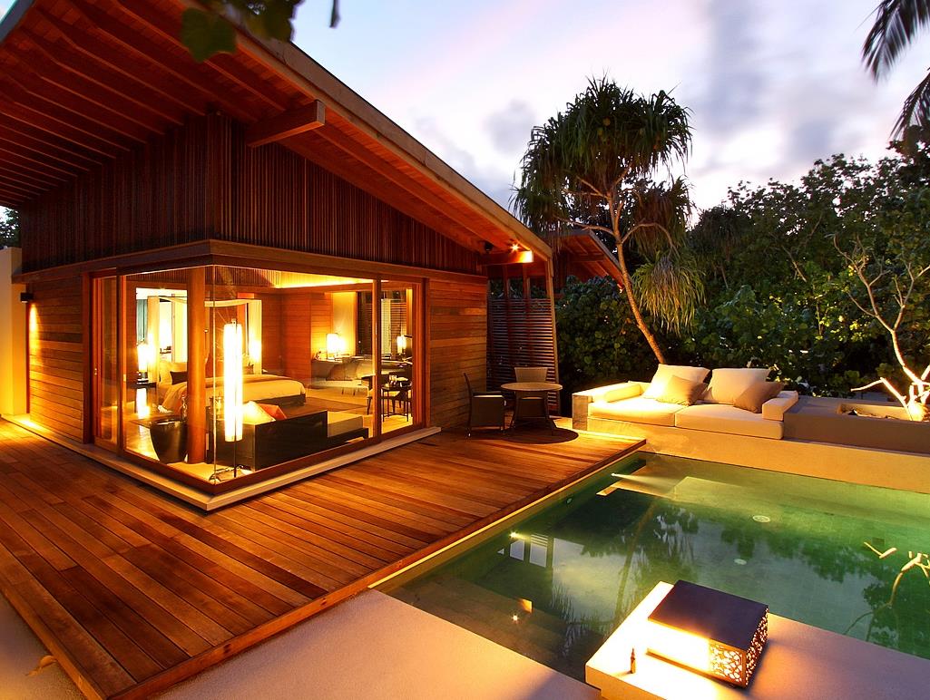 천연 목재를 사용한 목조건물로 자연친화적인 인테리어가 돋보이며 객실내에서도 몰디브의 자연을 최대한 느낄 수 있도록