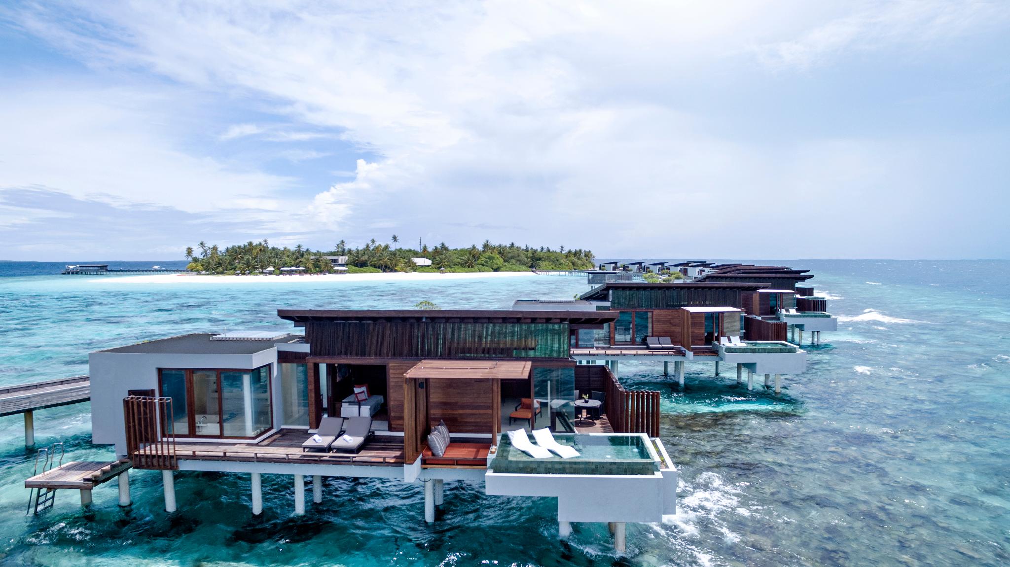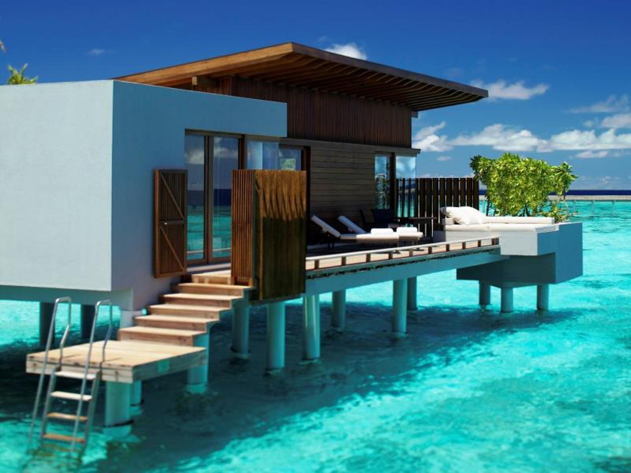 인도양의 탁 트인 바다와 선셋을 감상할 수 있는 고급스러운 수상 객실입니다.